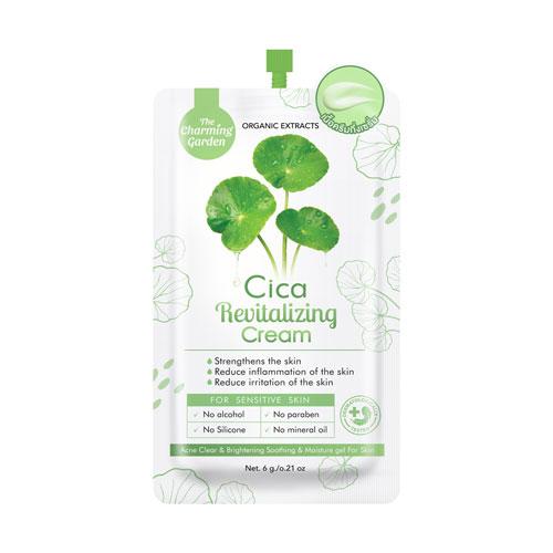 The Charming Garden Cica Revitalizing Cream 6g. A soothing cream enriched with Cica extract to help calm and nourish the skin. It helps provide moisture, reduce dryness, and support a smoother, healthier-looking complexion with a soft, comfortable feel.